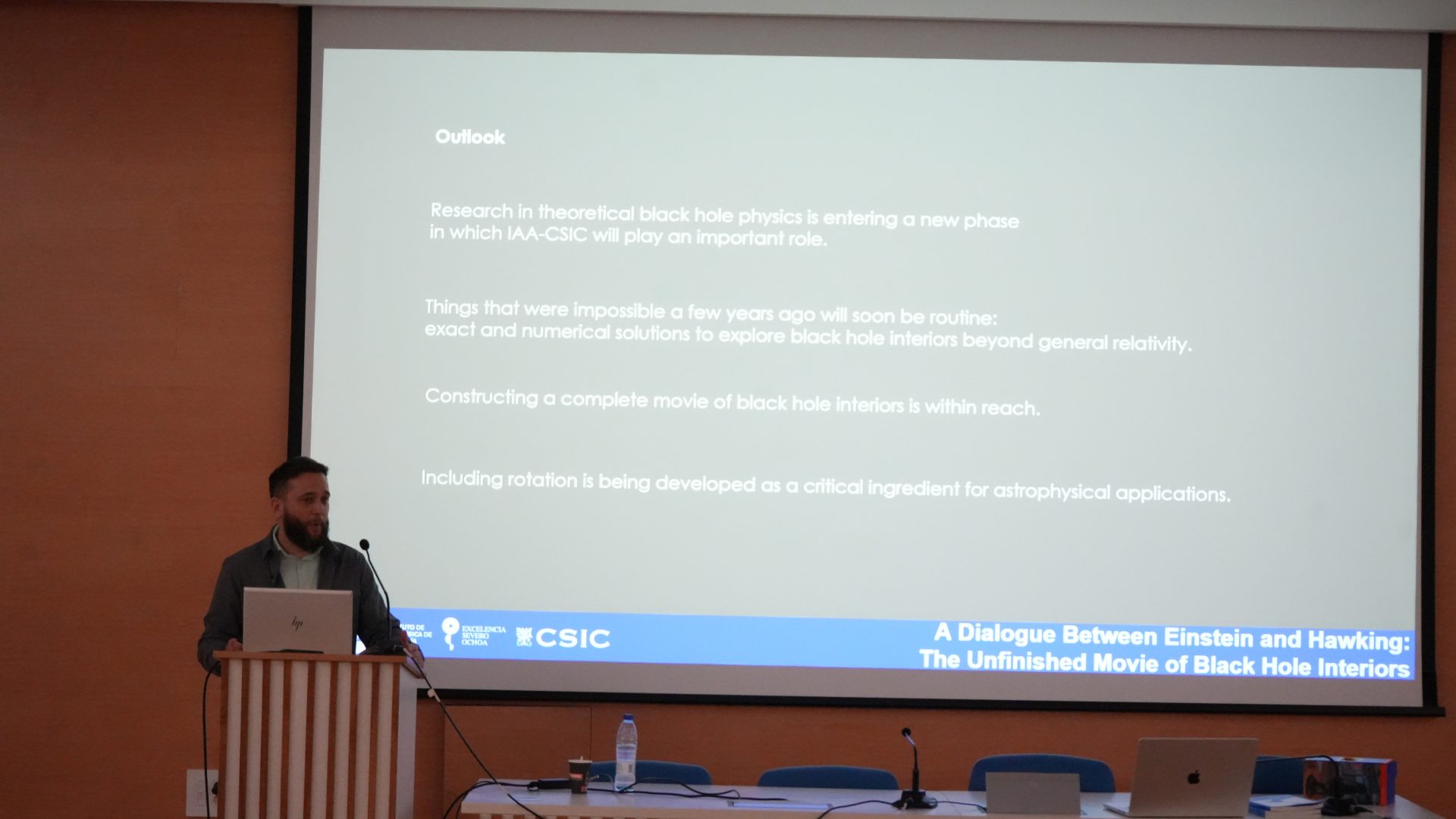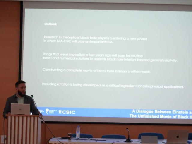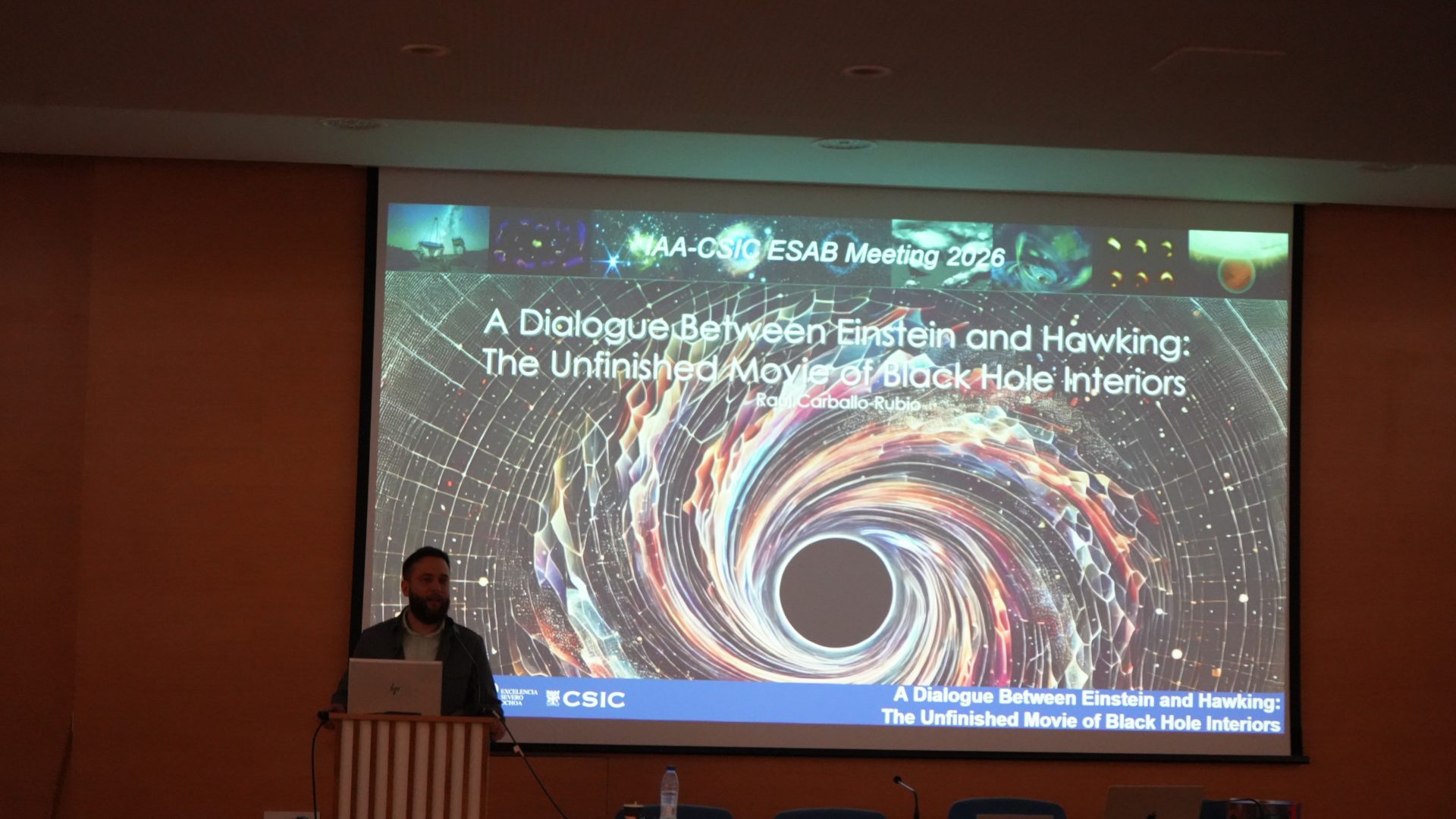 - 11:30 – 11:45: A Dialogue Between Einstein and Hawking: The Unfinished Movie of Black Hole Interiors. Raúl Carballo