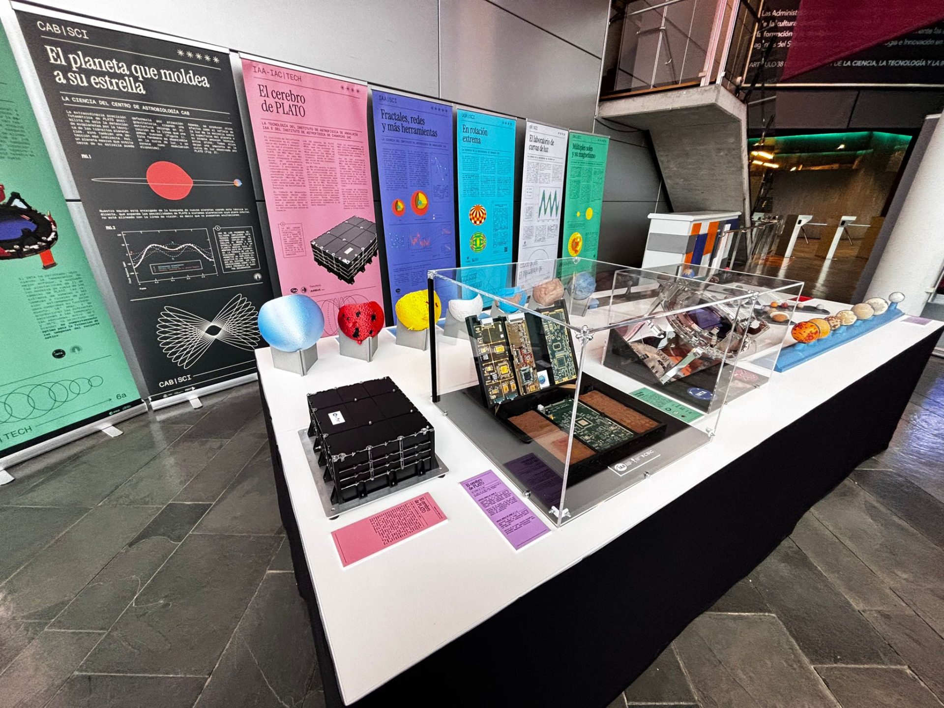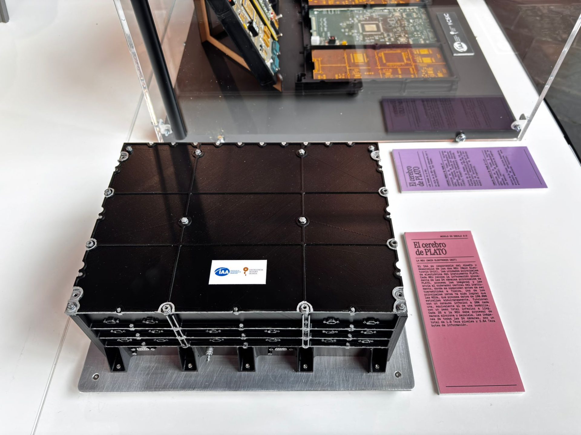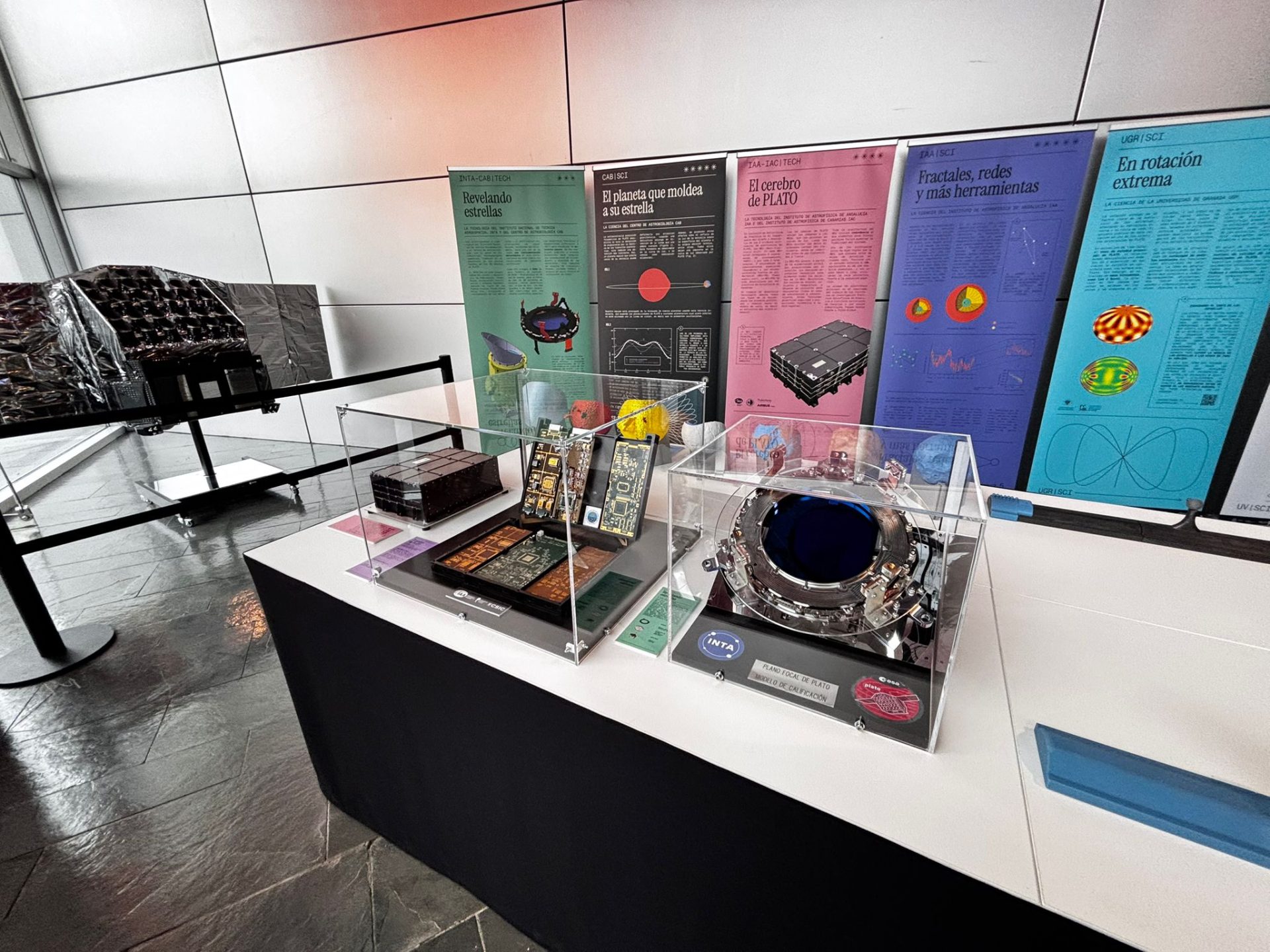 La propuesta se completa con una maqueta a escala de la nave espacial PLATO cedida por la ESA y con vitrinas que albergan componentes tecnológicos desarrollados en centros españoles implicados en la misión. Entre ellos se incluyen modelos de la Main Electronic Unit (MEU), desarrollada en el IAA-CSIC, con algunas tarjetas electrónicas originales en distintas fases de desarrollo —incluida la fuente de alimentación diseñada en el Instituto de Astrofísica de Canarias (IAC)— y la Focal Plane Unit (FPU), desarrollada en el Instituto Nacional de Técnica Aeroespacial (INTA). Estos elementos permiten mostrar al público el trabajo de ingeniería que sustenta la obtención y el procesamiento de los datos científicos del satélite.