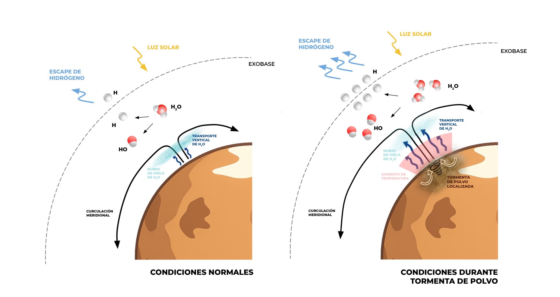 El fenómeno no se quedó solo en la atmósfera media. Las observaciones independientes de las misiones EMM y MRO, mostraron que, poco después, aumentó de forma notable la cantidad de hidrógeno en la exobase ––la región donde la atmósfera se mezcla con el espacio––. Como consecuencia, el escape de hidrógeno al espacio se incrementó aproximadamente 2,5 veces respecto a años anteriores durante la misma estación.