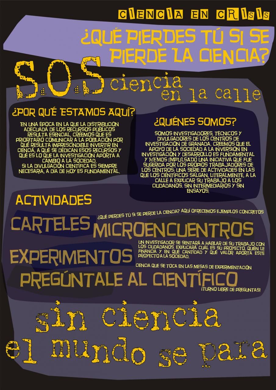 Especialmente duros fueron los recortes en ciencia derivados de la crisis financiera de 2008. En 2012 salimos a la calle para demostrar que sin ciencia no hay futuro, que sin ciencia el mundo se detiene. Lo simbolizamos con un espectacular flashmob en el centro de Granada.