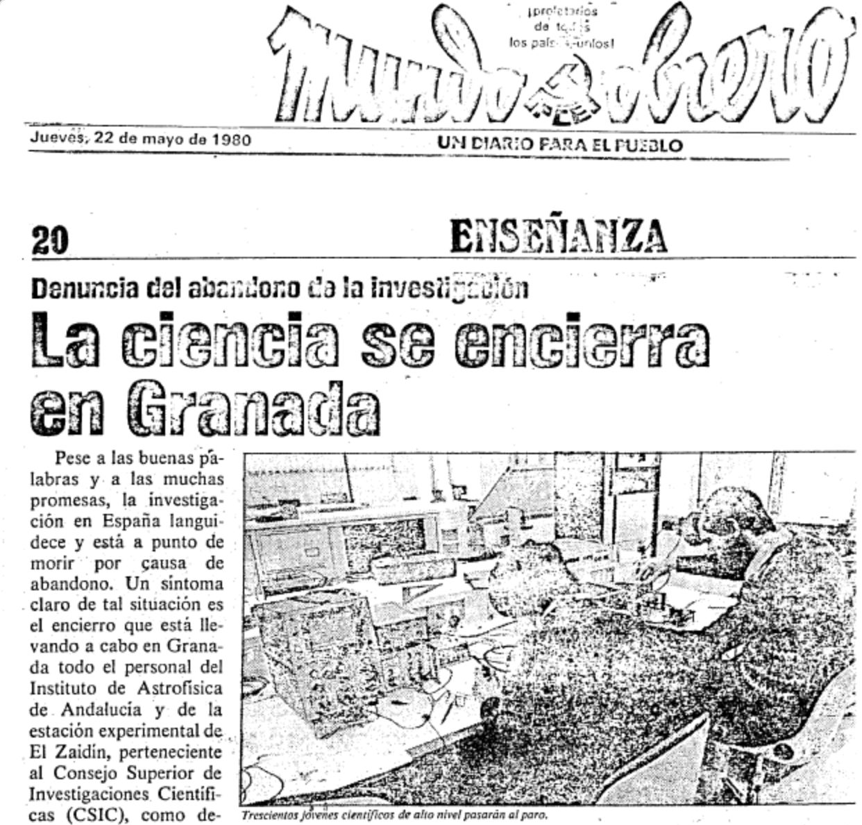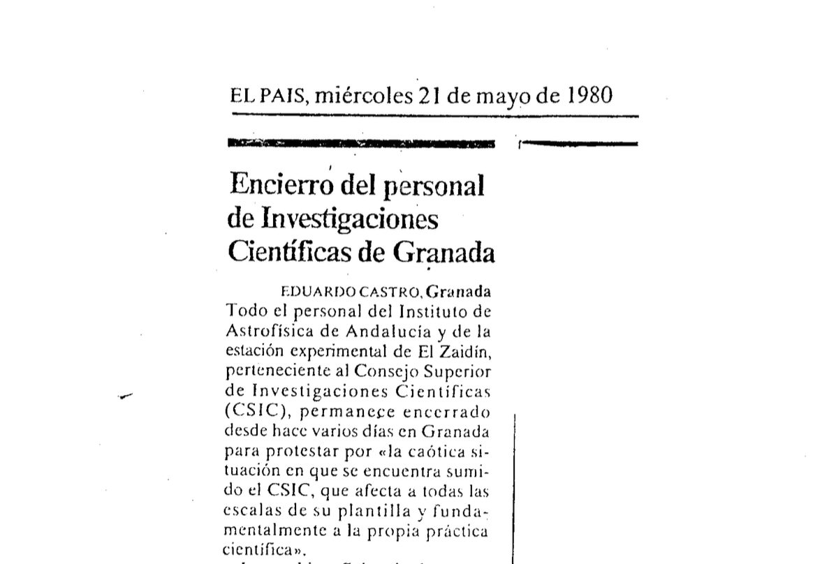 La primera nos llevó, a comienzos de los ochenta, a encerrarnos con nuestros colegas de la Estación Experimental del Zaidín (EEZ). ¿El motivo? Protestar por la “caótica” situación de la ciencia española, especialmente por la falta de una estructura clara en la carrera científica y técnica, la escasa inversión en I+D y los sueldos bajos y desiguales. Fue una de las primeras veces que la situación de la ciencia española saltó a los medios de comunicación, y no solo locales, sino también nacionales. Aquel encierro fue replicado en otras provincias.