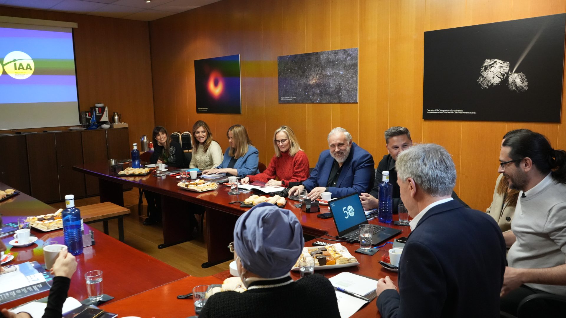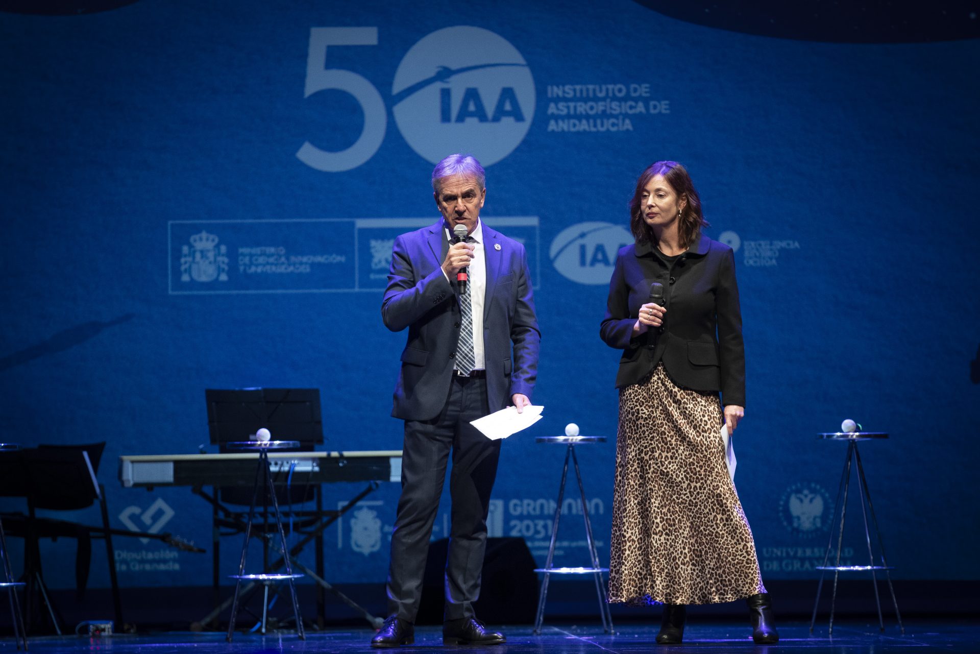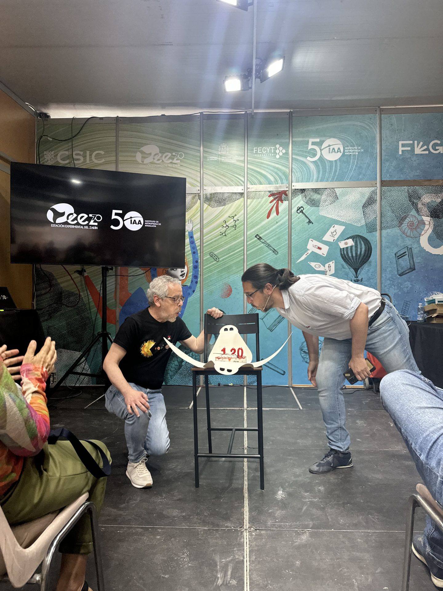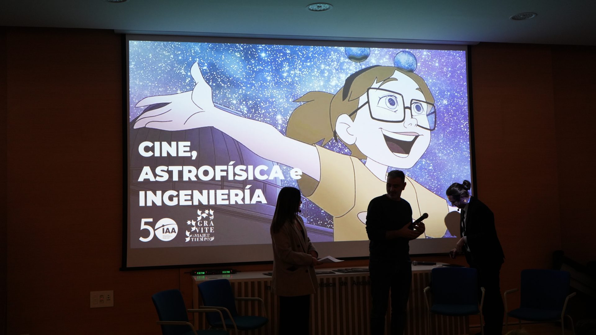 El teatro se intercaló con proyecciones audiovisuales que recorrieron la historia del IAA: desde su fundación en los años setenta hasta su consolidación como centro de excelencia Severo Ochoa, pasando por sus etapas de crecimiento, los retos afrontados, los avances científicos, la instrumentación desarrollada y su compromiso con la divulgación científica. Fue un emotivo fin de fiesta…