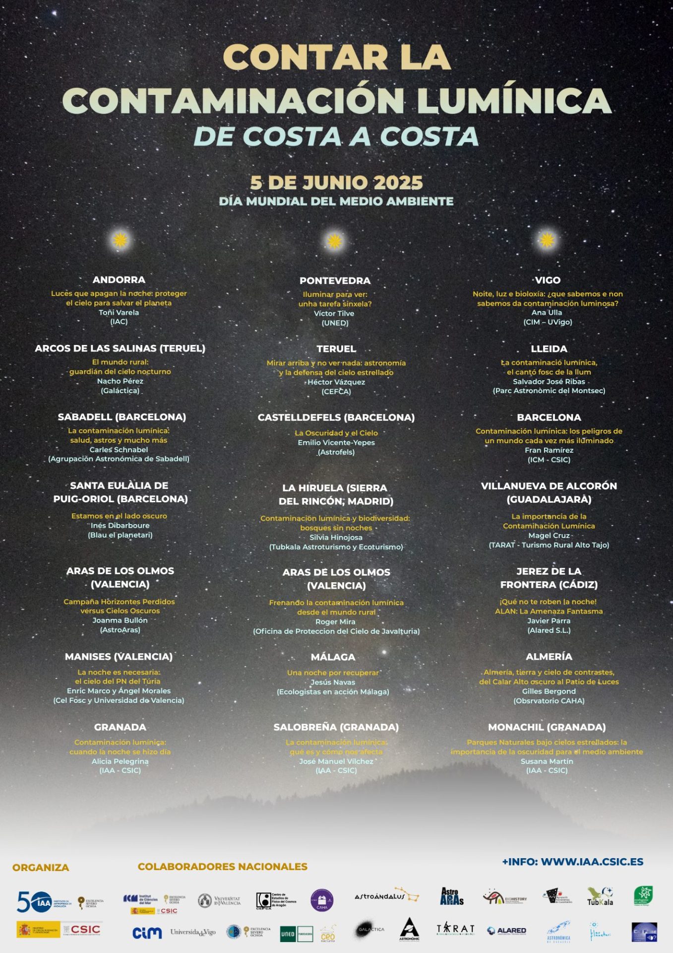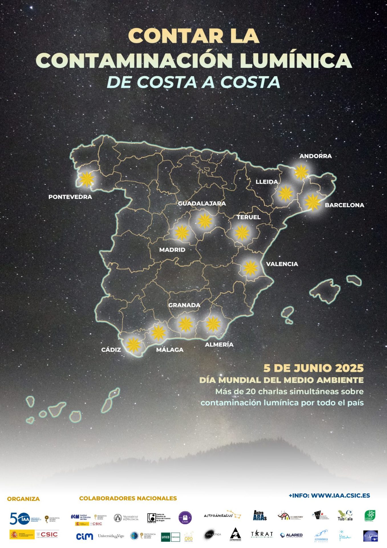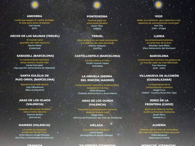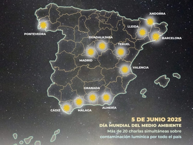 Por último, y con motivo del Día Mundial del Medio Ambiente, nuestra Oficina de Calidad del Cielo, a través de Alicia Pelegrina, coordinó una espectacular actividad en el que se simultanearon veintiuna charlas divulgativas en diecinueve ciudades españolas. El objetivo era concienciar al público general sobre esta amenaza creciente de la contaminación lumínica. Literalmente fue ‘Contar la contaminación lumínica de costa a costa’.
