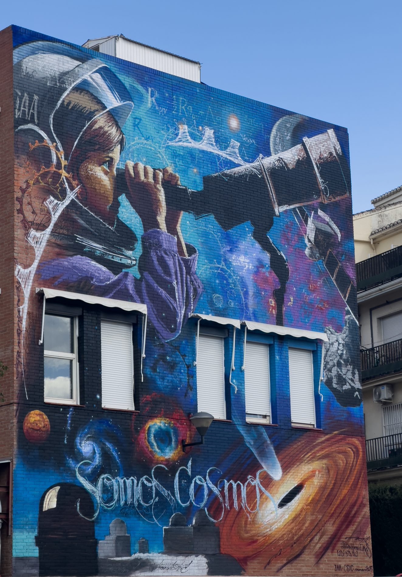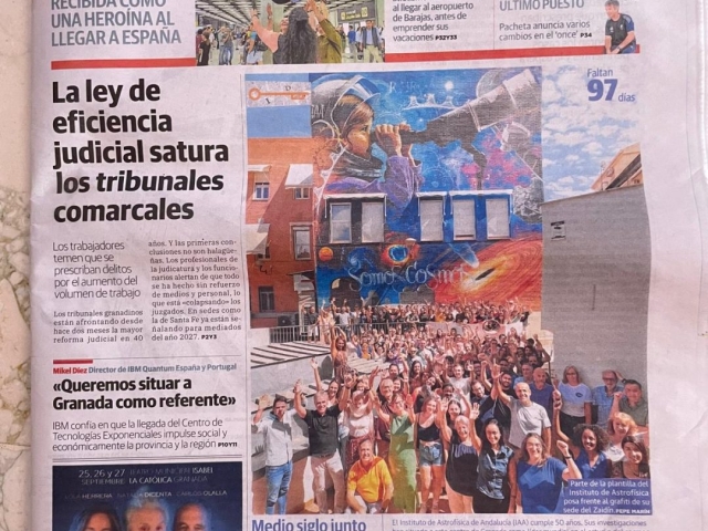 Con un extraordinario grafiti lleno de referencias astronómicas, el IAA ha quedado integrado en el circuito del arte urbano de Granada y Andalucía, ofreciendo a la ciudadanía una obra emblemática y perdurable en nuestro barrio y que ya forma parte de nuestra imagen propia junto a nuestro cohete de la entrada principal.