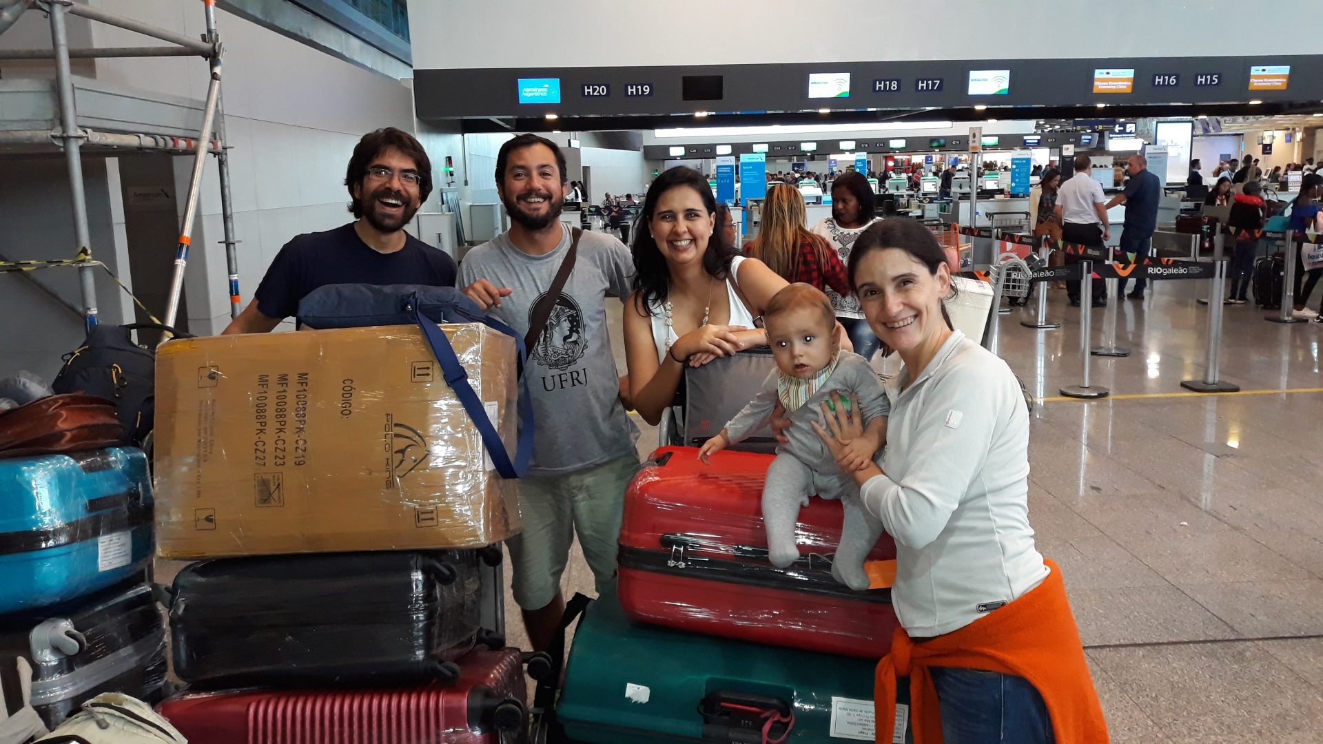 Yoli y Álvaro en el aeropuerto, con su hijo Martín y sus maletas, listos para volver a España